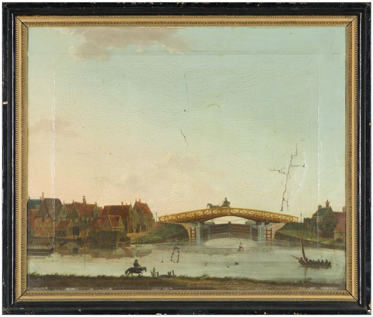 Gezicht op sluis en brug met omgevende huizen, vermoedelijk Staveren