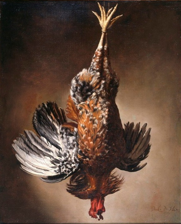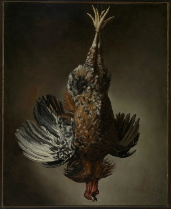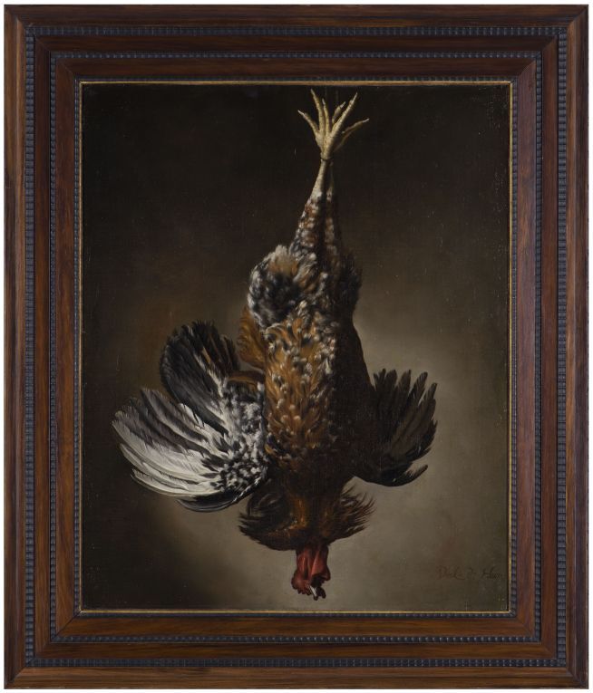 Stilleven met opgehangen kip of haan