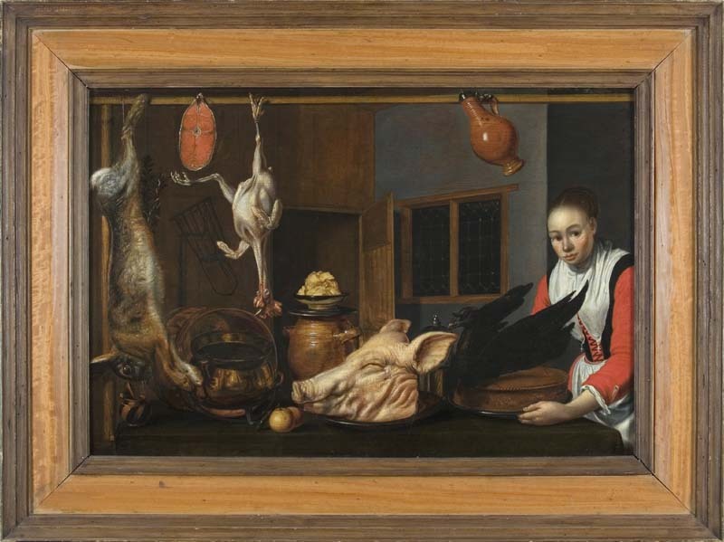 Stilleven met keukeninterieur met dienstmeid, appels, varkenskop en bord