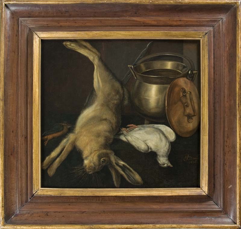 Stilleven met daarop onder anderen dode vogel, haas, duif en bronzen kookpot