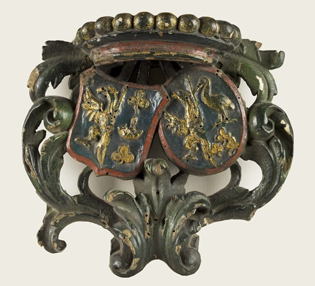 Onderscheidingsteken, blazoen, afbeelding van een (adellijk, stedelijk, staats)wapen in een glas-in-loodraam, op een portret, op een kerkgestoelte, op een rouwbord, op een wapenbord, op een grafzerk, op een door een gilde of broederschap geschonken object in de kerk. https://data.cultureelerfgoed.nl/term/id/cht/7c884119-cc2d-41db-8df7-a9e838d5ccca