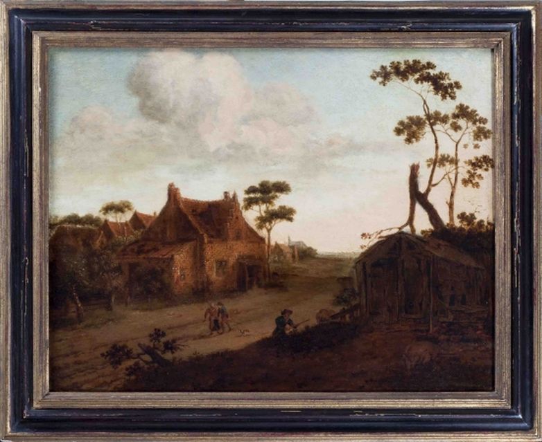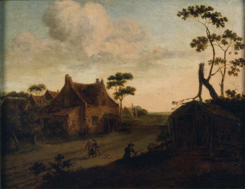 Dorpsgezicht met huizen en vervallen schuur en op de achtergrond een kerktoren