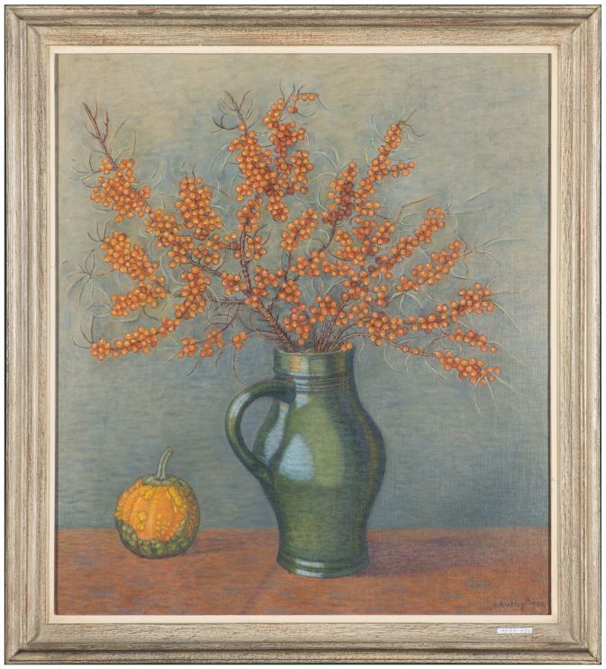 Stilleven met duindoorn en sierkalebas
