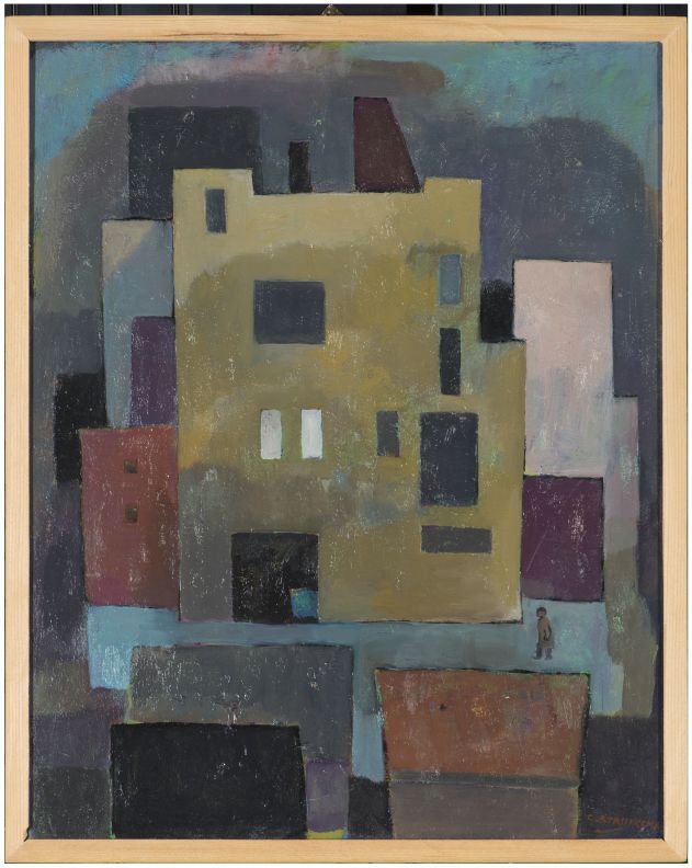 Kompositie met gebouwen en wandelaar
