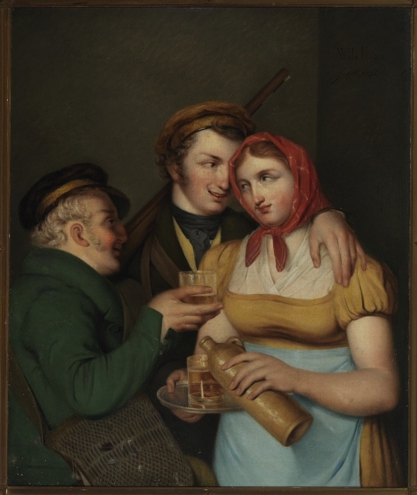 Jonge vrouw schenkt drank in glazen voor twee jagers