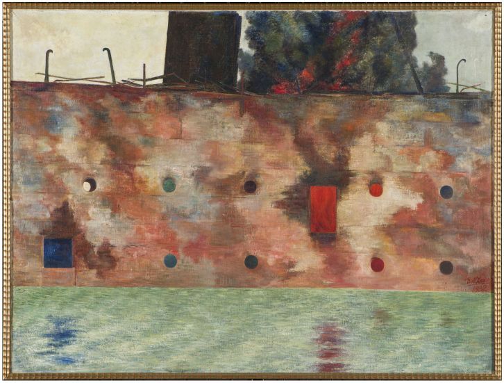 Brandende scheepsromp, met schoorsteen en patrijspoorten, 1932
