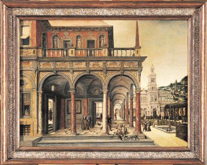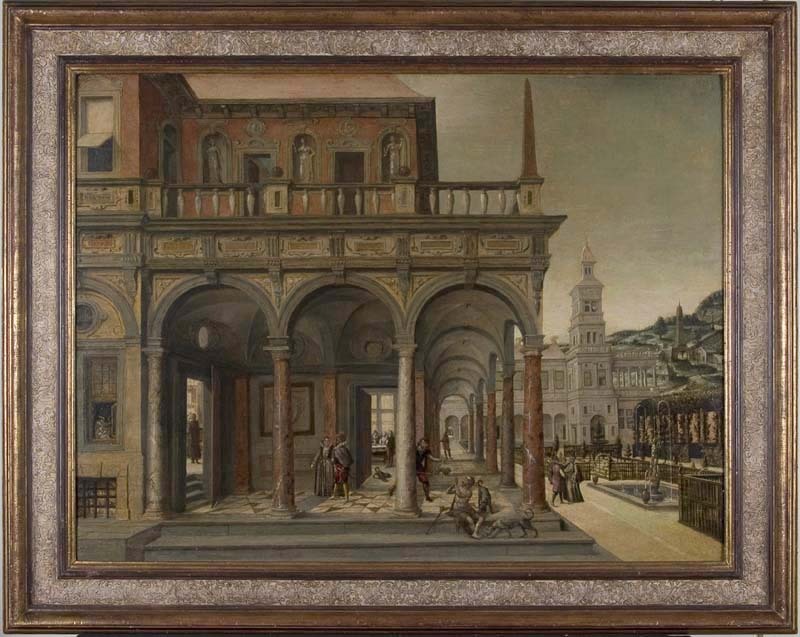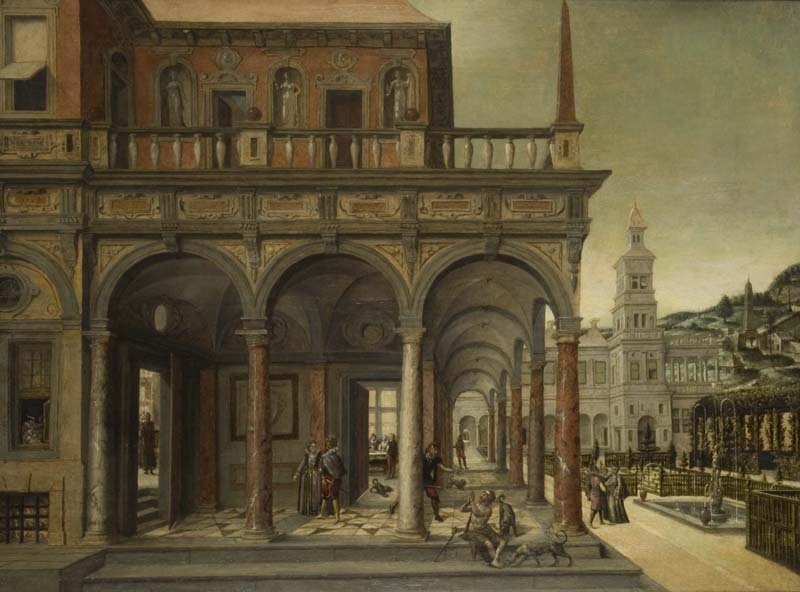 Architectuurstuk met gebouwen rondom een tuin, waarin voorstelling van de arme Lazarus en de rijke man