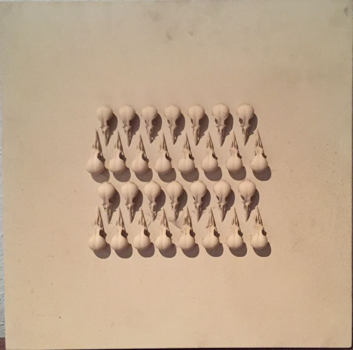 Tien paneeltjes met vogelskeletten en -koppen