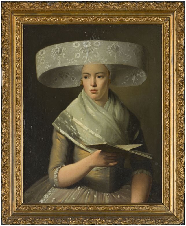 Portret van een onbekende vrouw met Duitse muts, boek in de hand