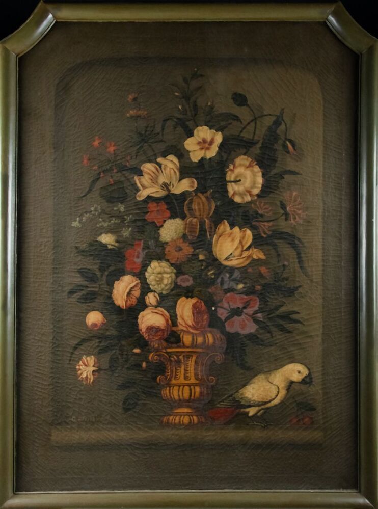 Bloemstilleven met rechtsonder een papagaai