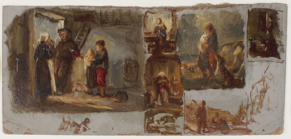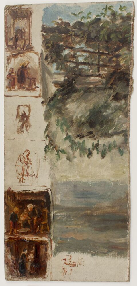 Dubbelzijdige schilderingen op board, recto: zeven voorstellingen waaronder van het Scheveningse vissersleven, verso: een voorstelling van groen, een zeegezicht, twee meer uitgewerkte taferelen en vijf schetsen