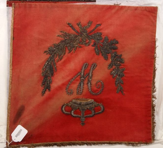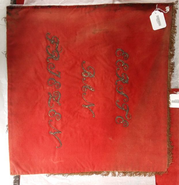 Vaandel van zwaar rood laken met zilver geborduurd en omzoomd met zilveren franje, onderdeel van groep van vijf vaandels met bijbehorende kwasten