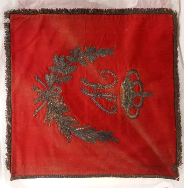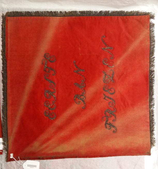 Vaandel van zwaar rood laken met zilver geborduurd en omzoomd met zilveren franje, onderdeel van groep van vijf vaandels met bijbehorende kwasten