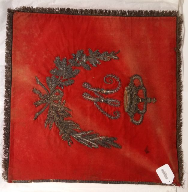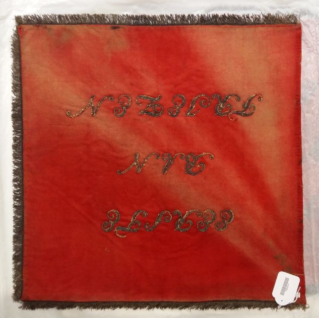 Vaandel van zwaar rood laken met zilver geborduurd en omzoomd met zilveren franje, onderdeel van groep van vijf vaandels met bijbehorende kwasten