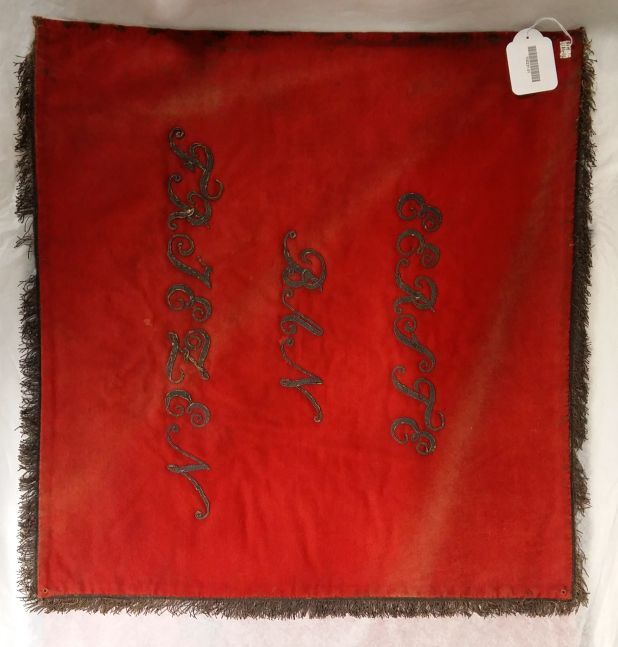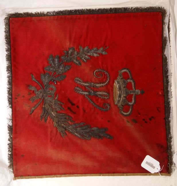 Vaandel van zwaar rood laken met zilver geborduurd en omzoomd met zilveren franje, onderdeel van groep van vijf vaandels met bijbehorende kwasten
