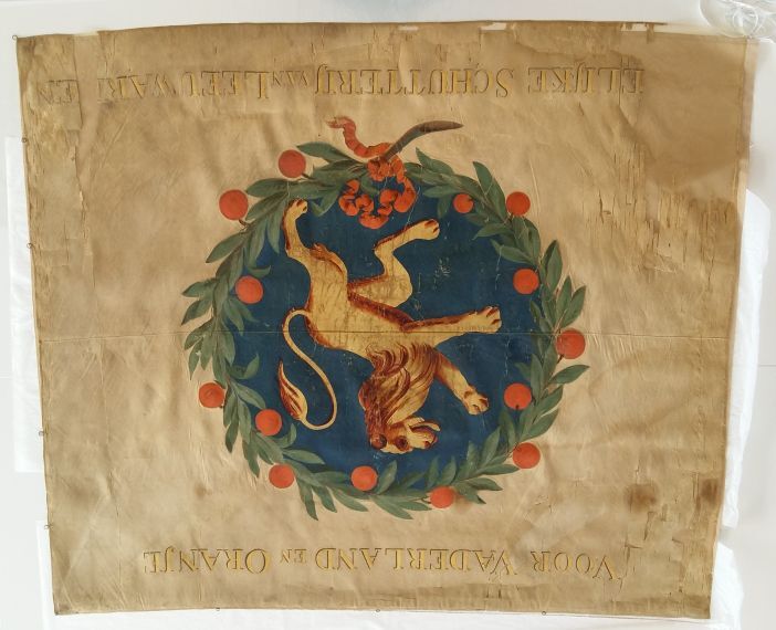 Vaandel van de Leeuwarder schutterij: Voor Vaderland en Oranje