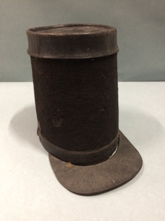 Hoge pet of sjako van een schutter, zwart leer bekleed met vilt, binnengekomen als groep van vijf onderdelen uniform
