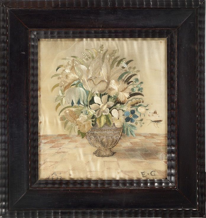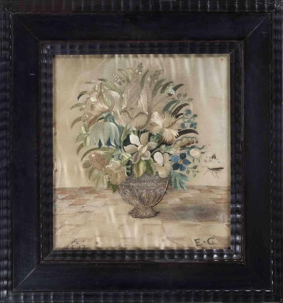 Geborduurde vaas met bloemboeket op zijden ondergrond