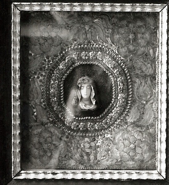 Geboetseerde vrouwenkop waaromheen fraai borduurwerk, in zeer antieke lijst achter glas, vervaardigd door A.M. Schurman