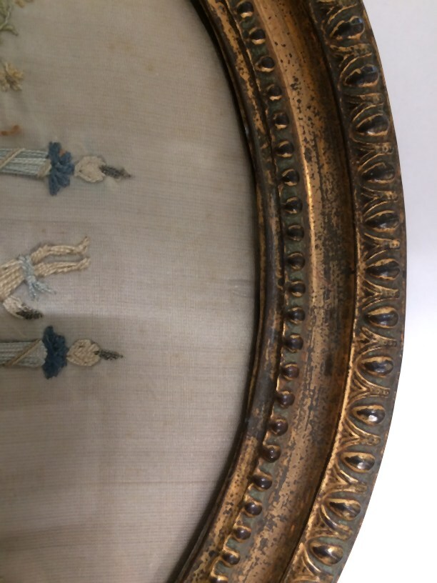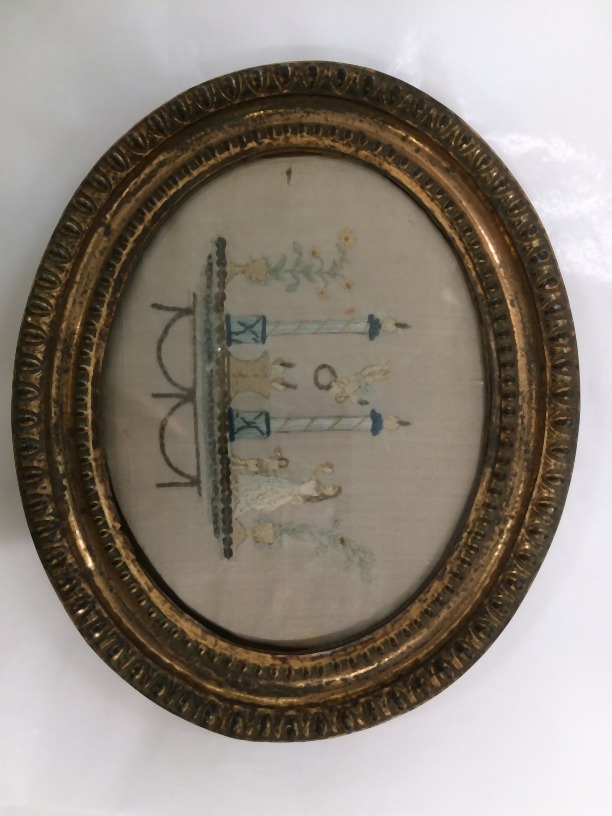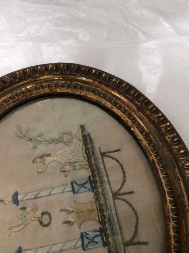 Borduurstuk van zijde achter lijst en glas, zinnebeeldige voorstelling in ovaal, het huwelijk
