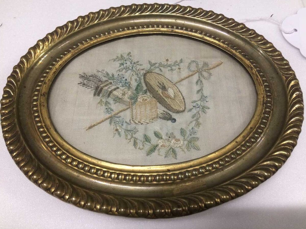 Borduurstuk van zijde achter lijst en glas, zinnebeeldige voorstelling in ovaal, het huwelijk