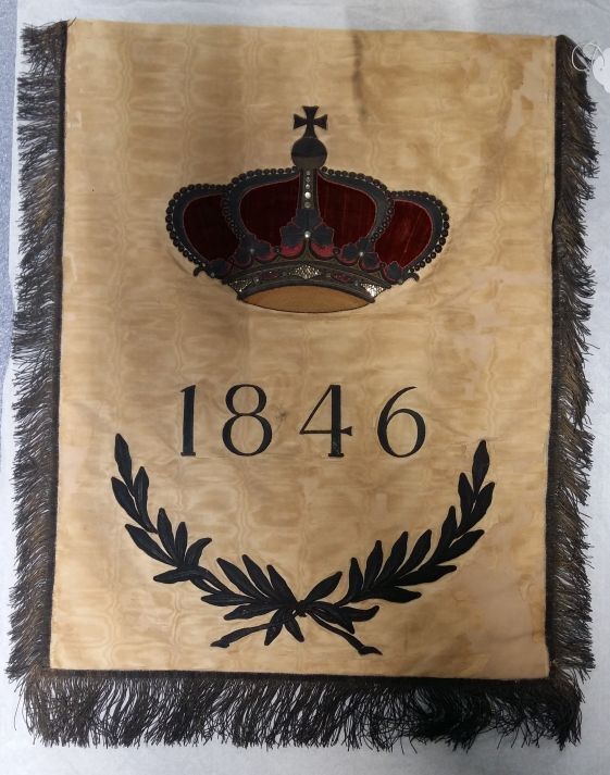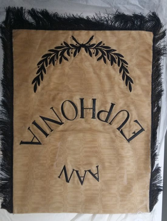 Tweezijdige vaandel van crème-kleurige moiré-zijde met de tekst AAN EUPHONIA