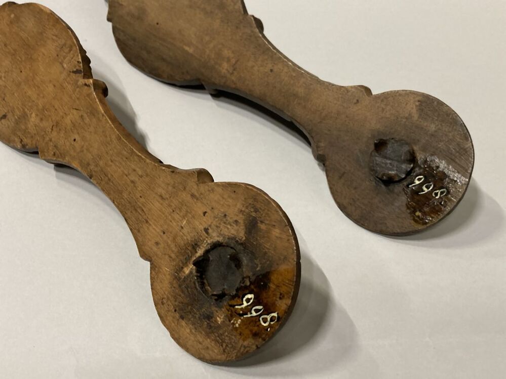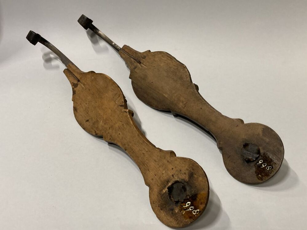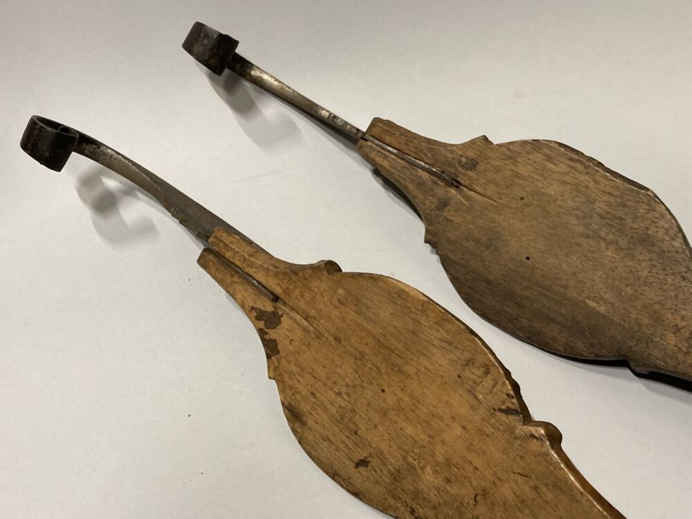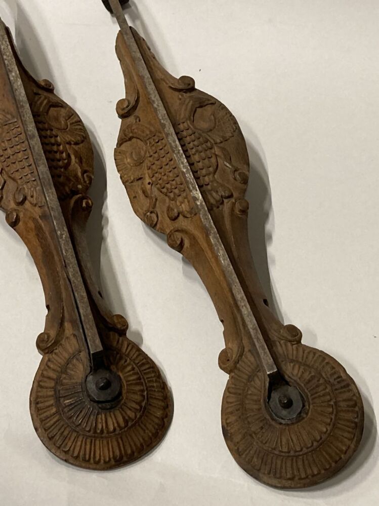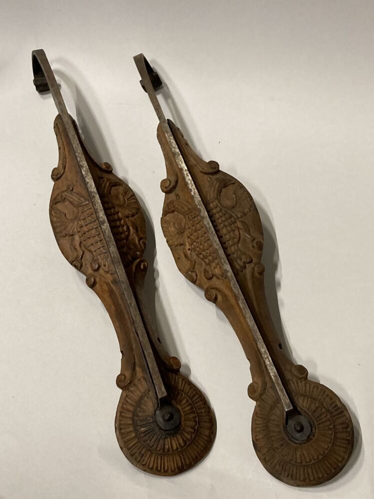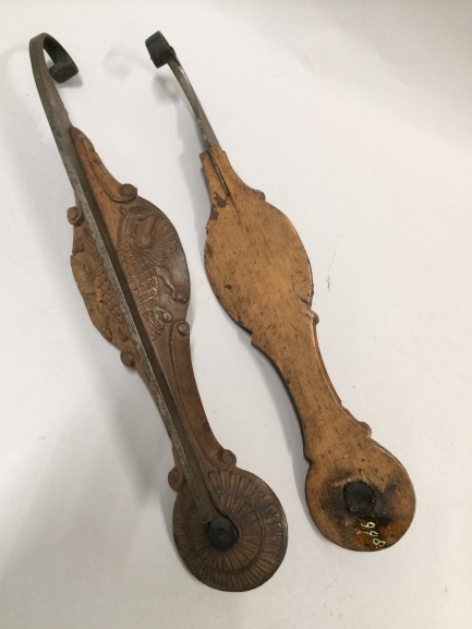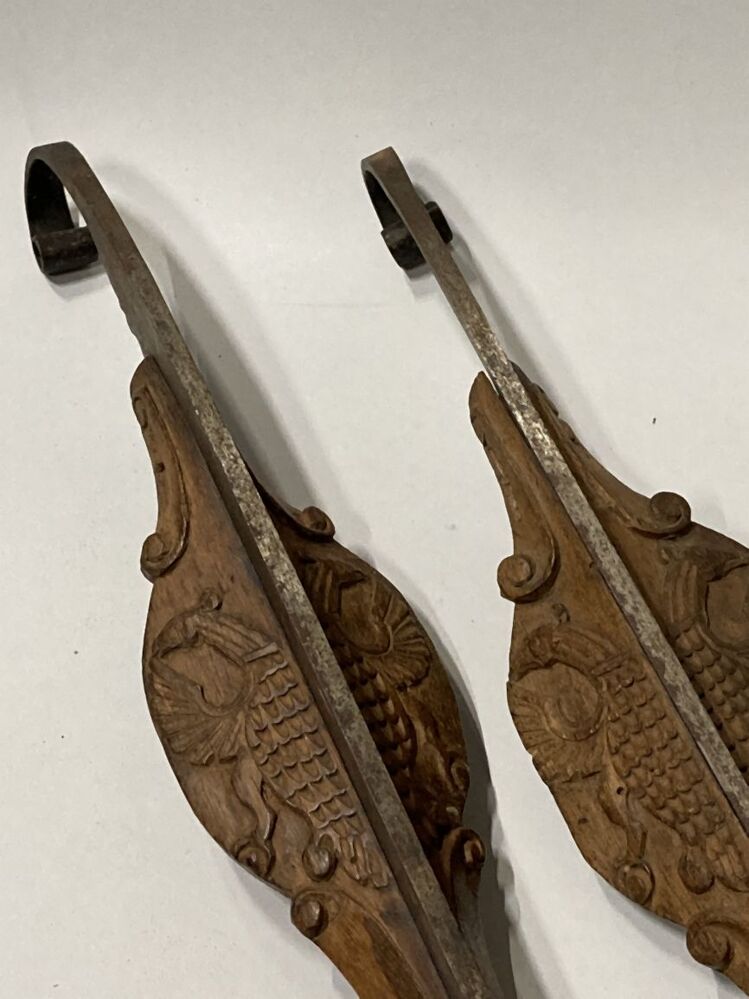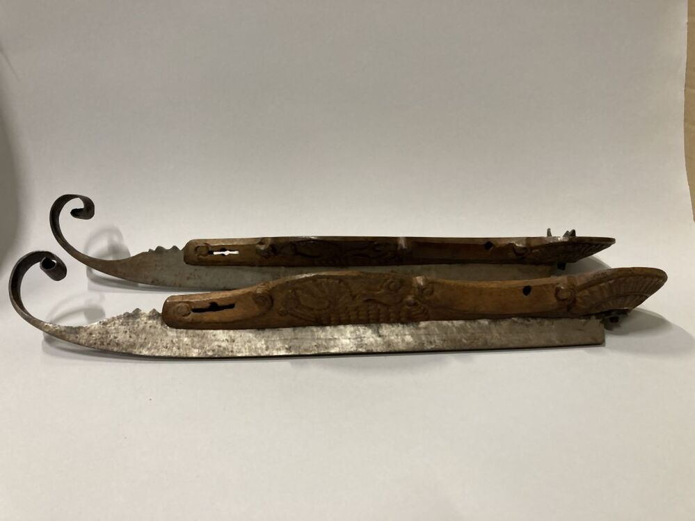 Paar antieke Friesche schaatsen, de benedenkant zeer fraai besneden, met twee tegen elkaar geplaatste halve adelaars