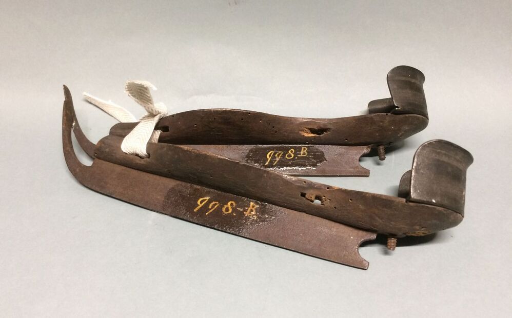 Een paar houten schaatsen met ijzer en messing haksteun