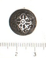 Gegoten ronde bolvormige knoop met achterop een oogje, bovenop de knoop een gegoten gelijkarmig kruis met rond hart