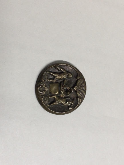 Knoop waarop afbeelding van aambeeld met links en rechts een smid