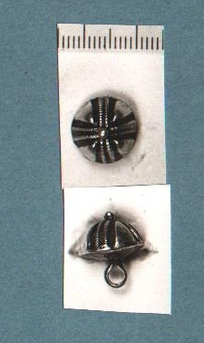 Twee halfbolvormige knopen met parelrandje en onderop een oogje, bovenop de knopen een gelijkvormig kruis