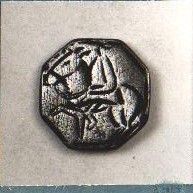 Elf gelijke platte achtkantige knopen met achterop een hoekig oogje, op de voorkant van de knopen een grof gegraveerde ruiter te paard