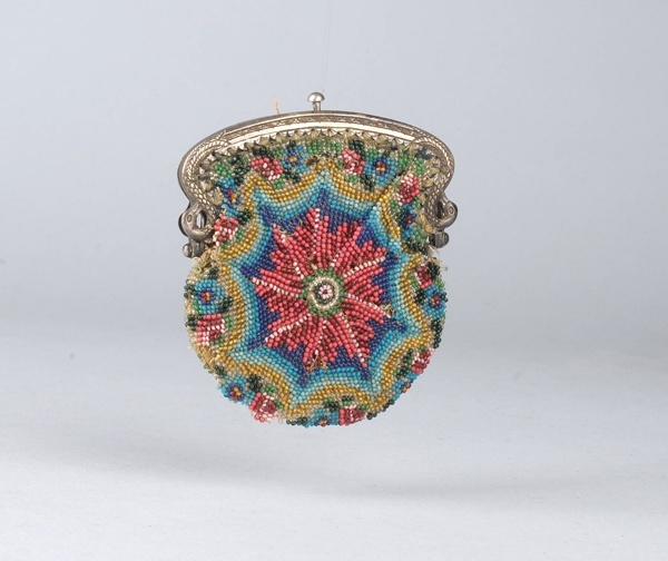 Beugelbeurs met beursje van kralen en in het midden een roze negenpuntige ster