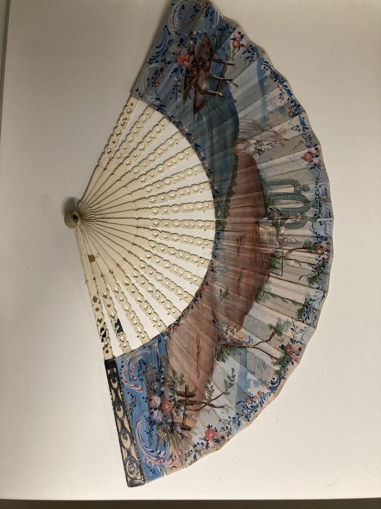 Huwelijkswaaier met rococo beschildering van fantasie landschap met figuren, met benen van ajour gesneden been