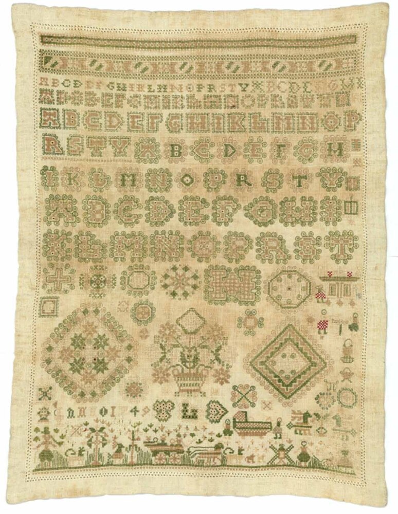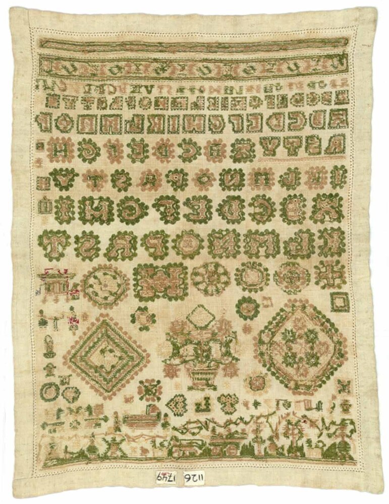 Merkletterlap in groen met beige, gemerkt T.L.D. anno 1749