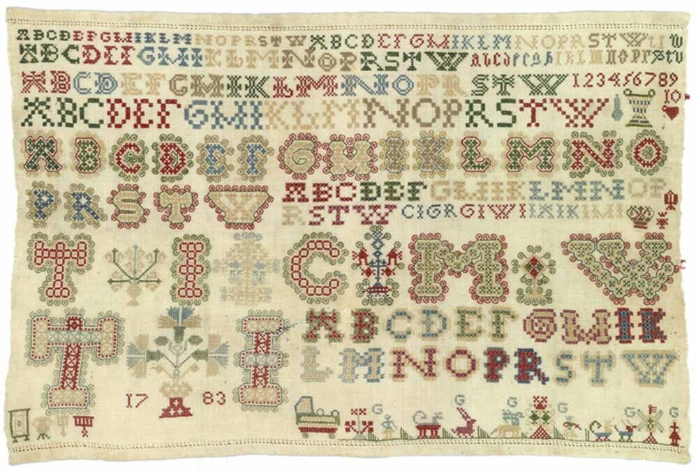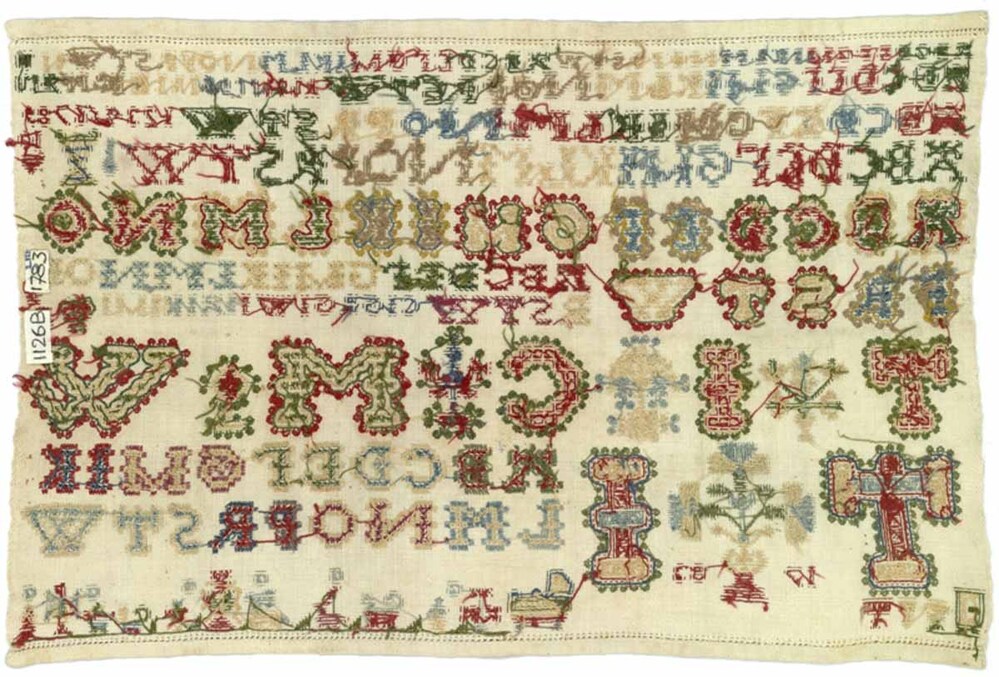 Lettermerklap met rood, beige, groen en blauw, gemerkt T.I.1783
