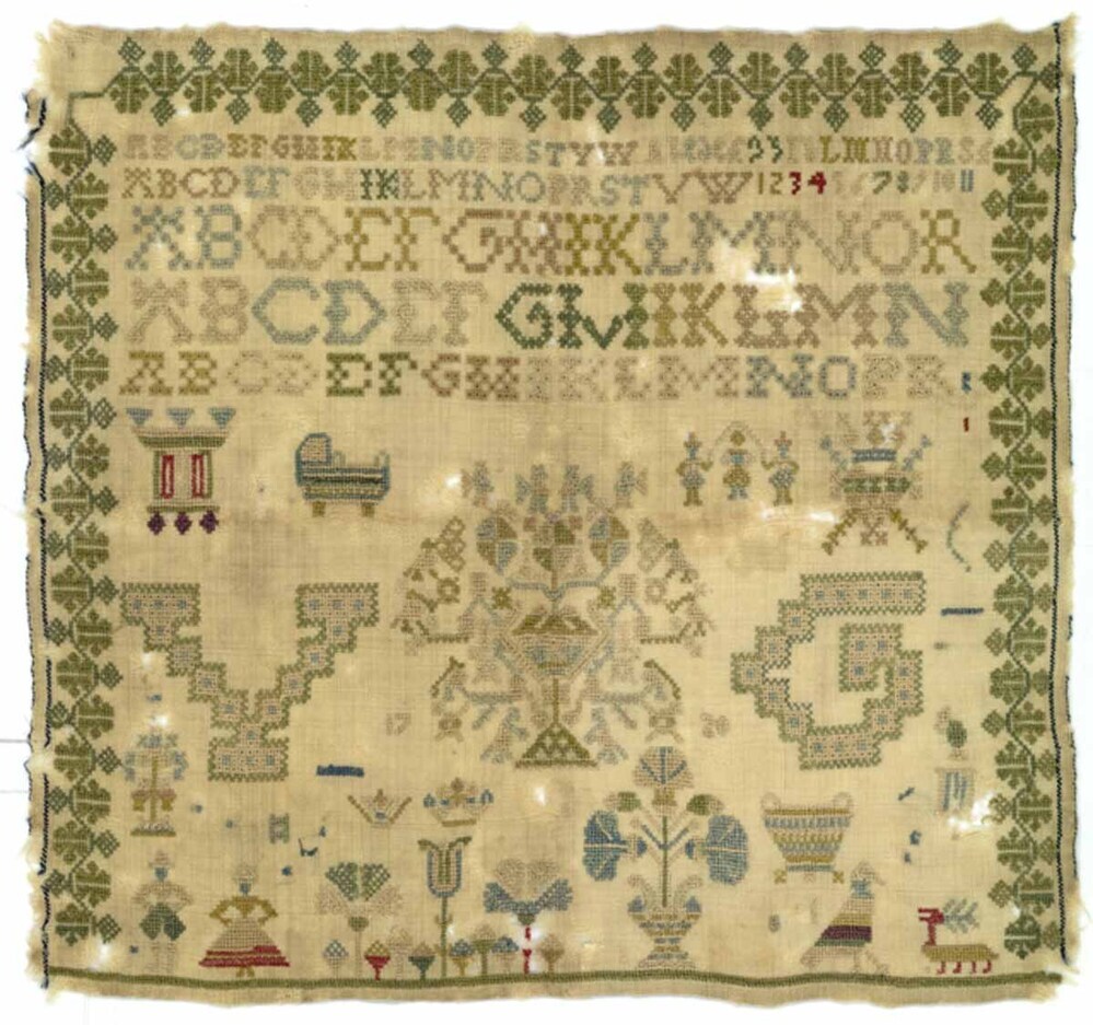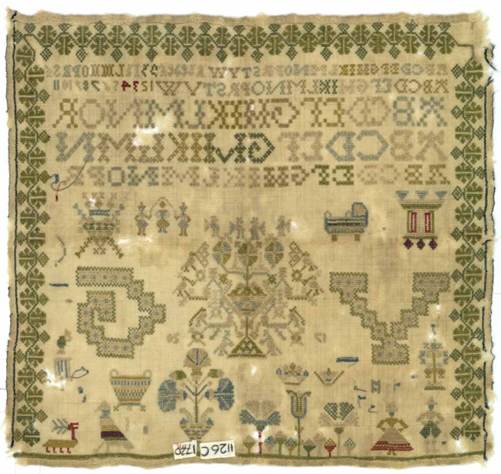 Merkletterlap op wollen mousseline met vijf rijen alfabetten, gemerkt VG, 1720