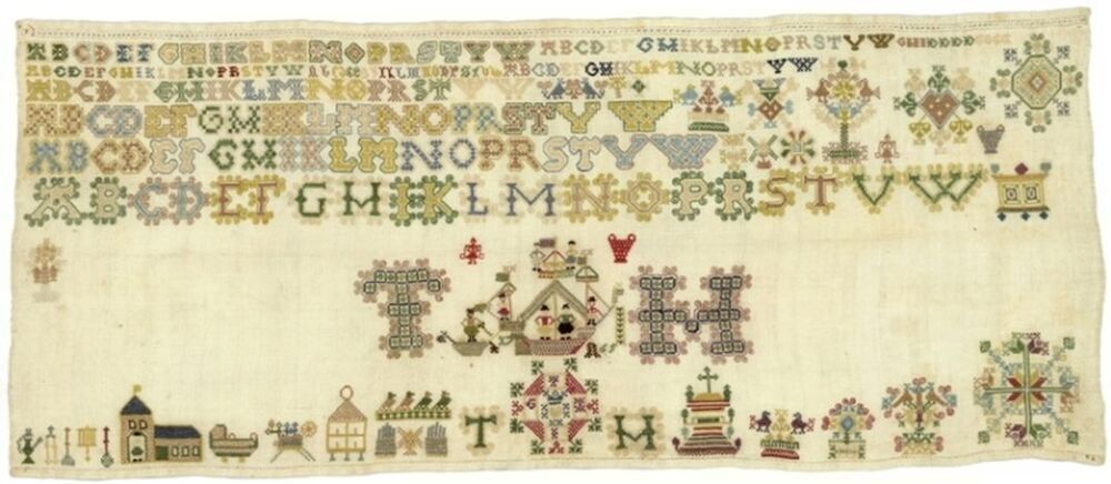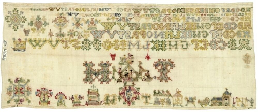 Merkletterlap, onaf, met schip in het midden, gemerkt T.H. 1765