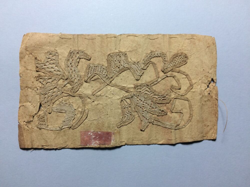 Proefstuk naaldkant op papier, met voorstelling van bloembouquet