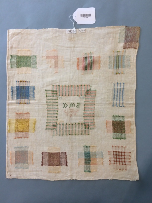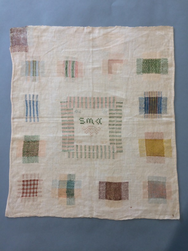 Stoplap van grof linnen, dertien stoppen met in het midden een losgesneden en vastgestopt vierkant , gekroonde initialen DWS, anno 1770