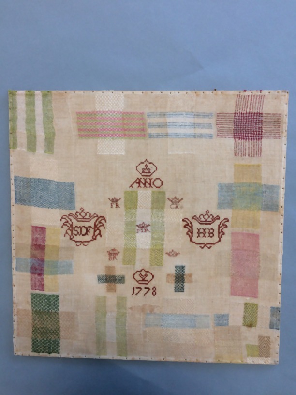 Stoplap van fijn katoen, opgespijkerd op board, centraal grote stop met gekroonde initalen MR, schilden met SIF en HB met rondom dertien stoppen, datering 1778
