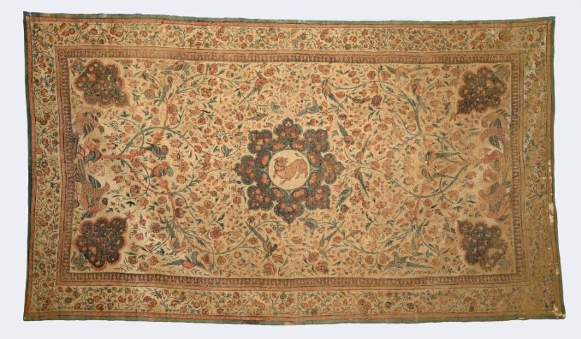 Sitsen tafelkleed met op de korte zijden een bloeiende boom met duiven, in het midden een rozet met een tijger, rondom rand met golvende bloemrank.