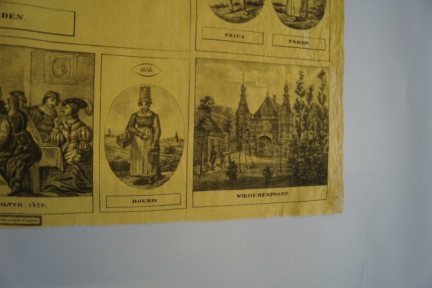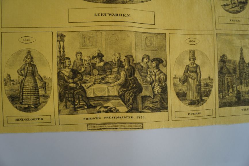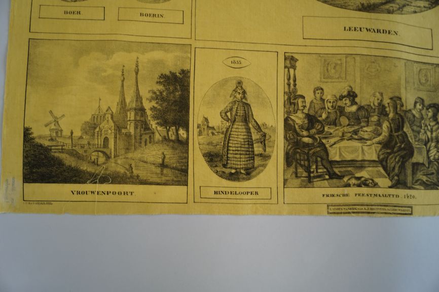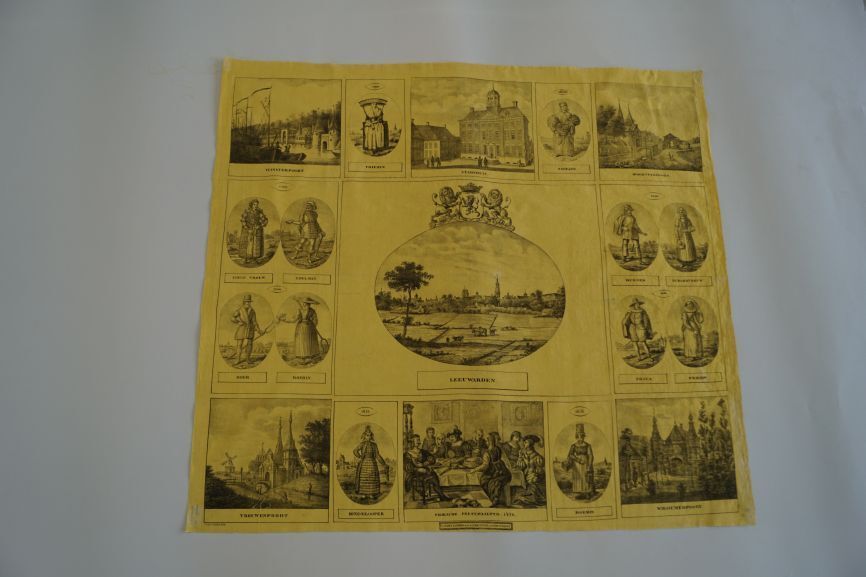 Friese gedenkdoek van bedrukt katoen in de kleuren geel en zwart met afbeeldingen van de Tuinsterpoort, een Friezin uit 1790, het Stadhuis te Leeuwarden, een Friezin uit 1836, de Hoeksterpoort te Leeuwarden, de Vrouwenpoort uit 1835, een Hindelooper, een Friese feestmaaltijd in 1420, een 1835 boerin en de Wirdumerpoort