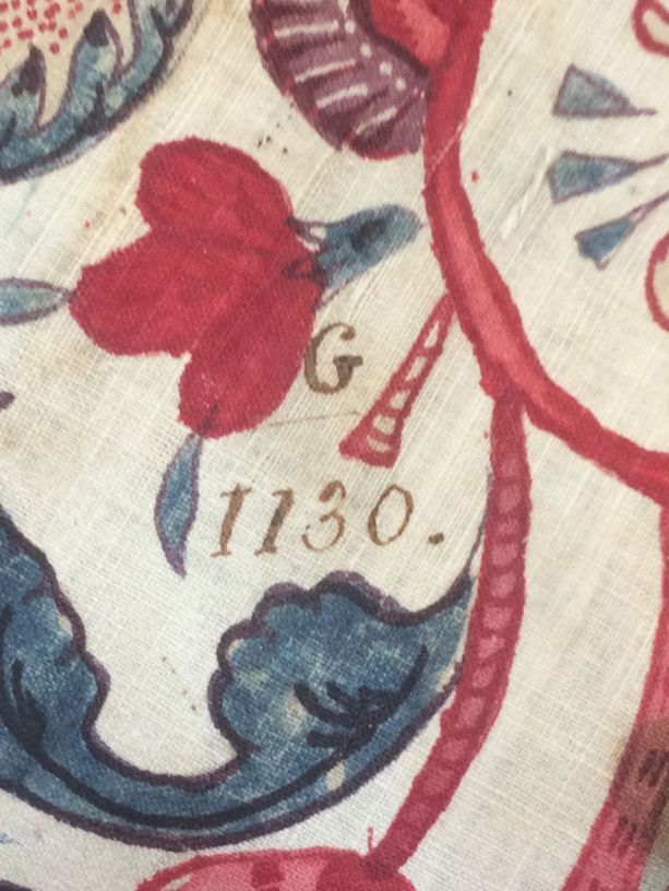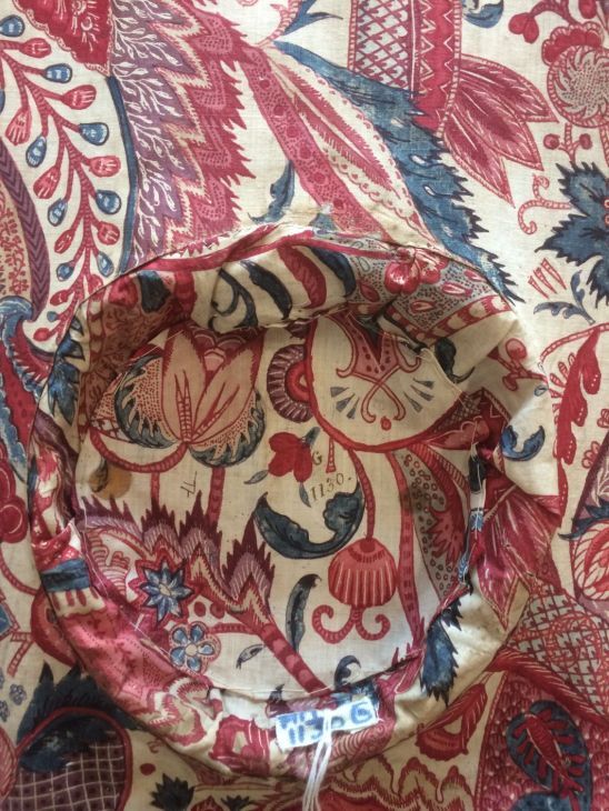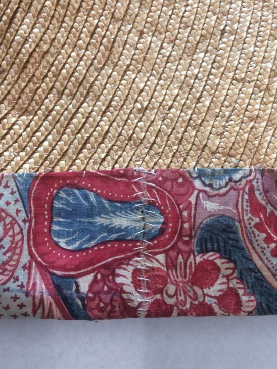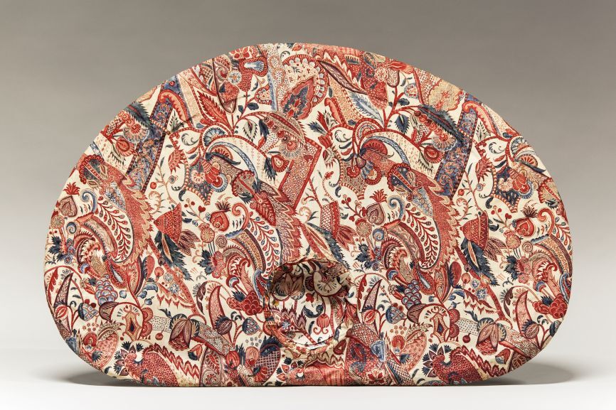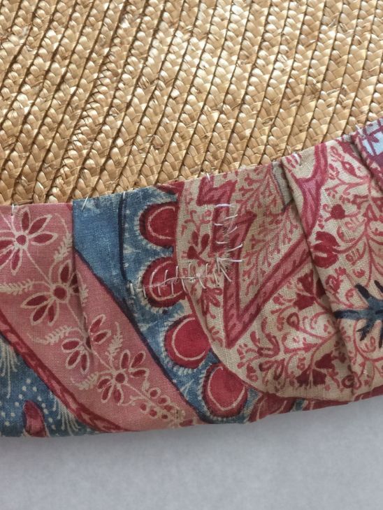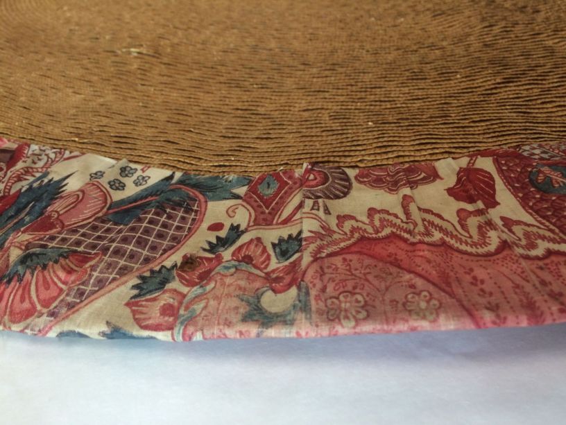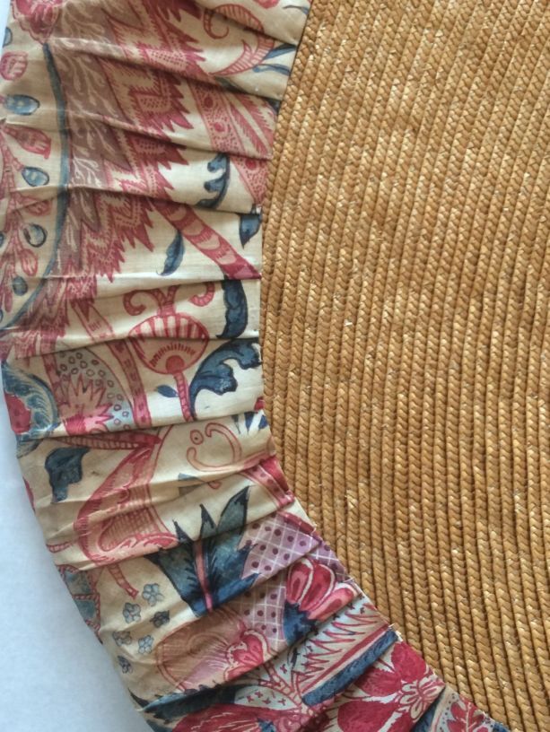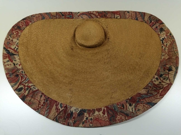 Zonhoed met sitsenvoering, beschilderd met bizar patroon van versierde banden en diverse soorten bloemen op witte grond