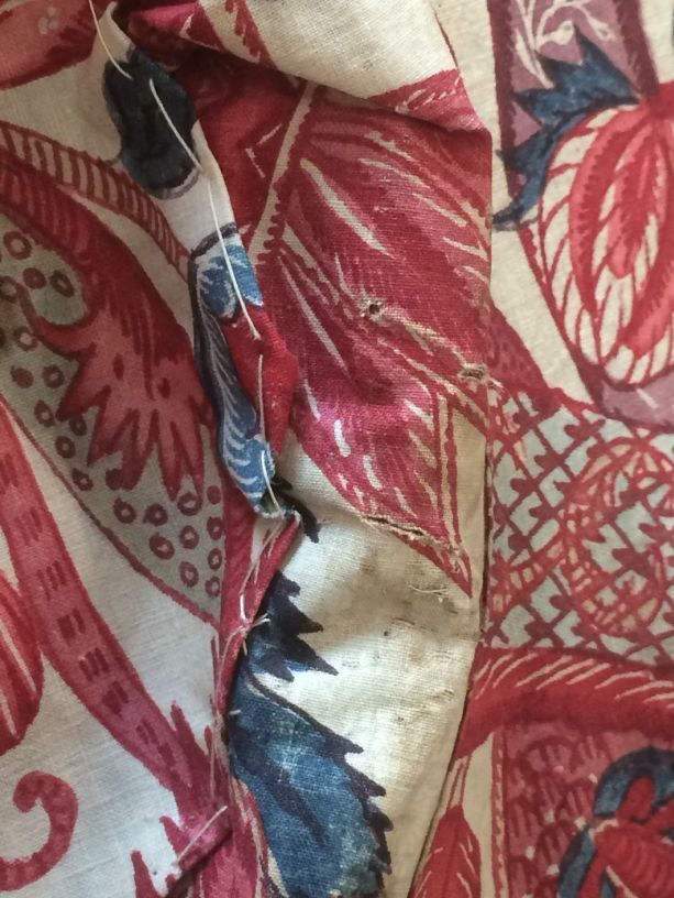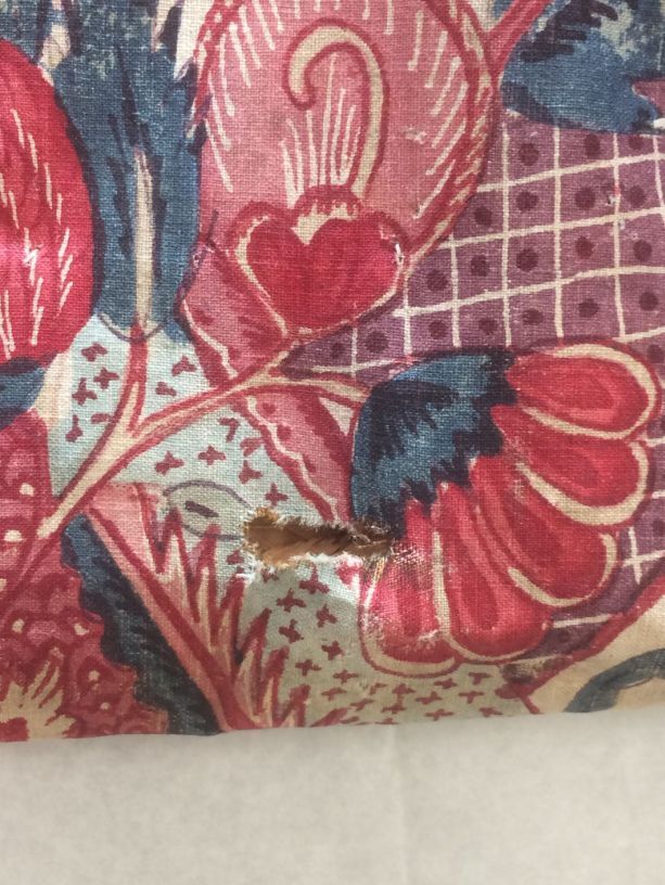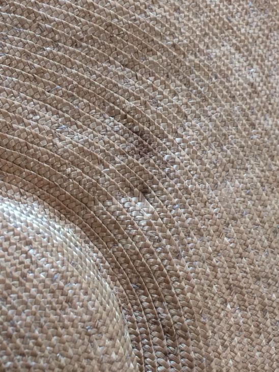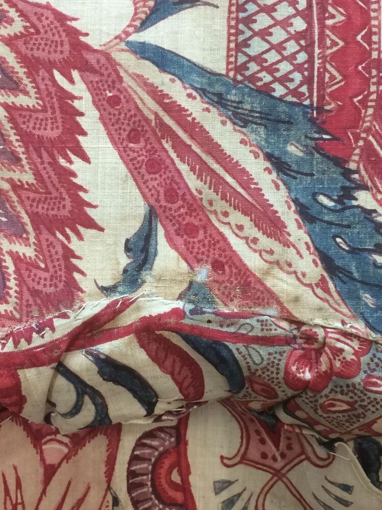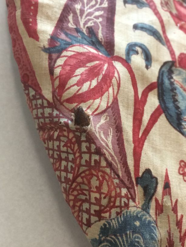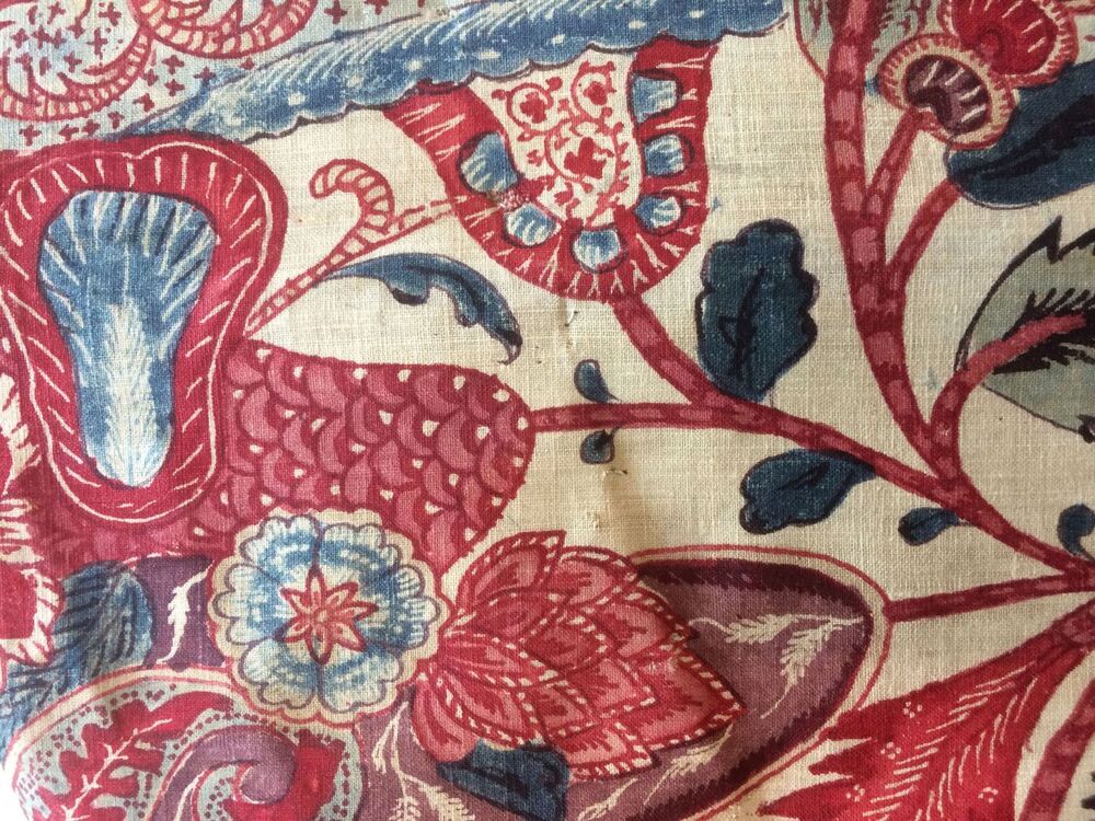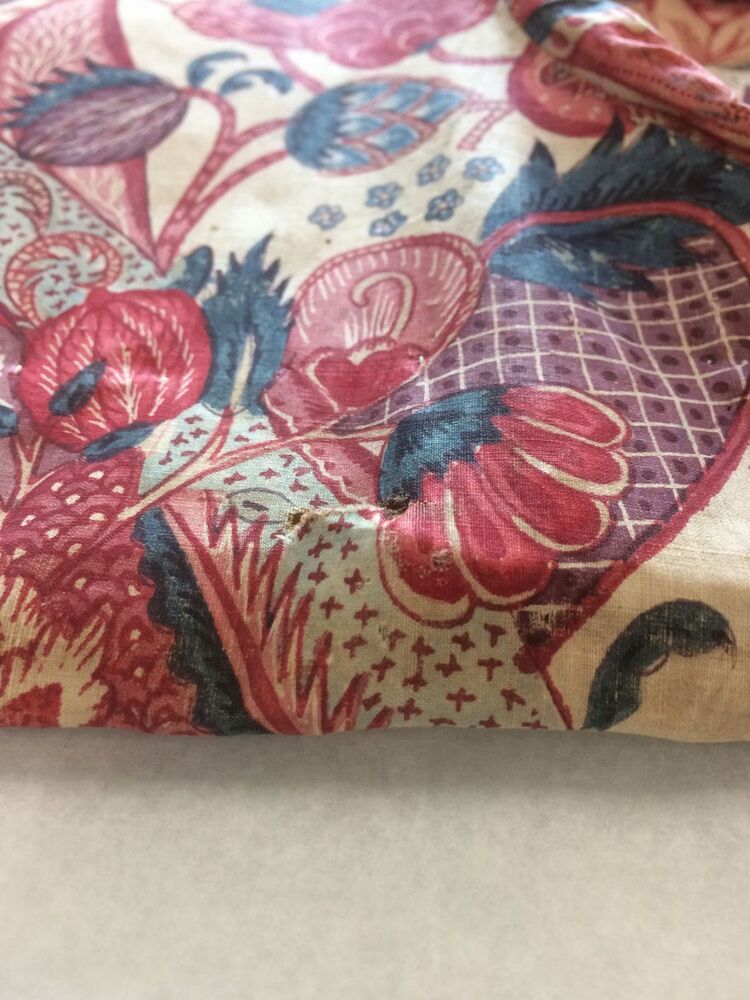 Zonhoed met sitsenvoering, beschilderd met bizar patroon van versierde banden en diverse soorten bloemen op witte grond