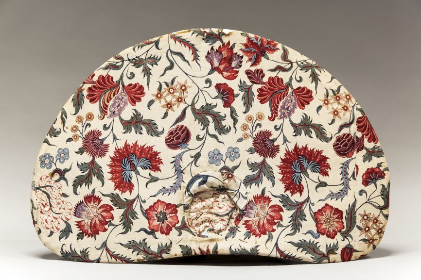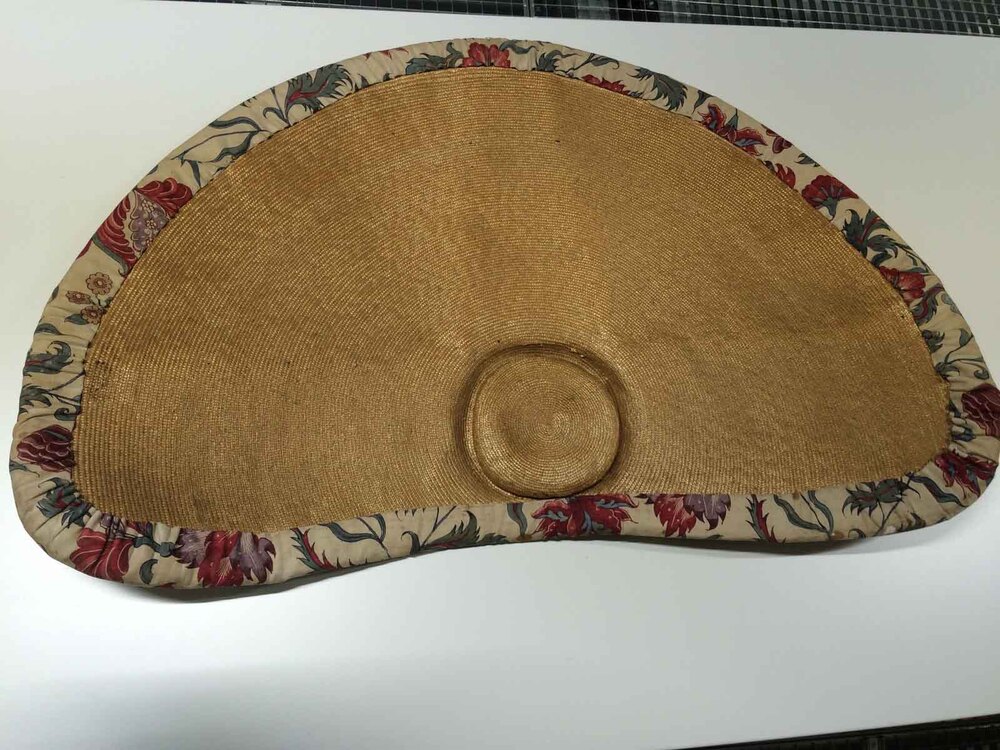 Zonhoed met sitsen voering, beschilderd met dunne krullende ranken met grote bloemen en pluisvormen op witte grond