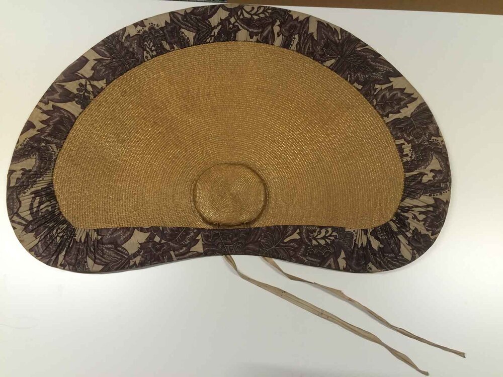 Strooien zonhoed bekleed met Indiaase sits met exotisch bloempatroon in paarstinten op witte grond, voor de rouw