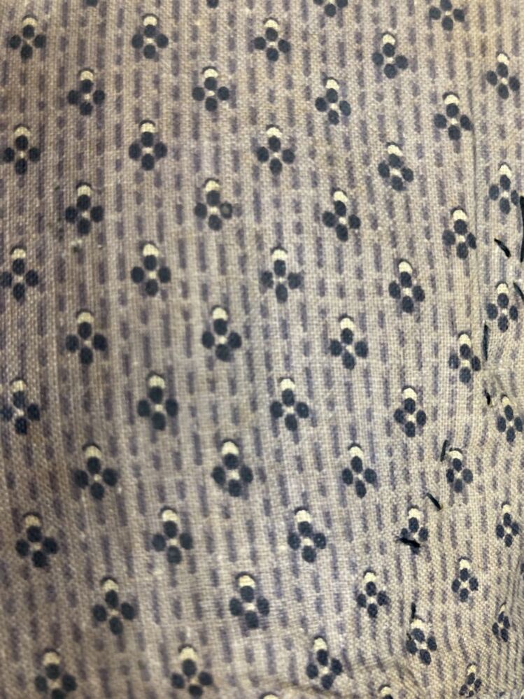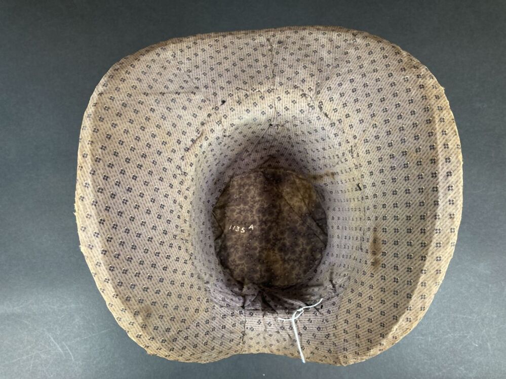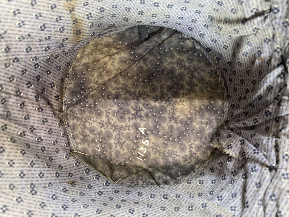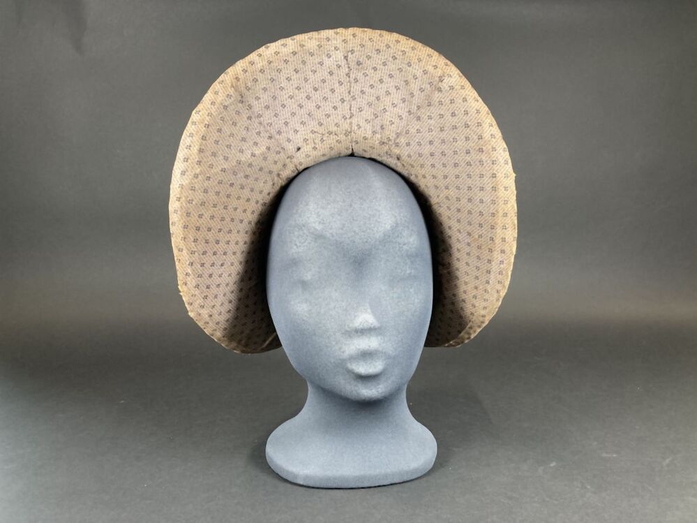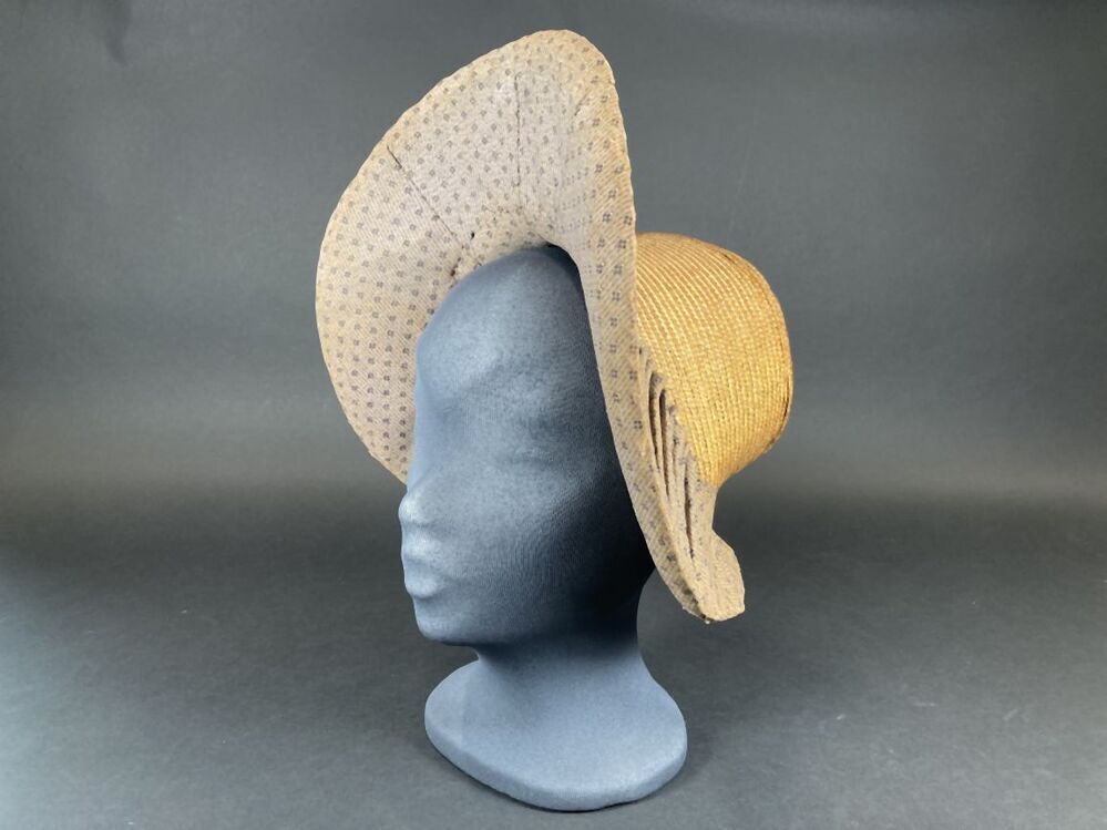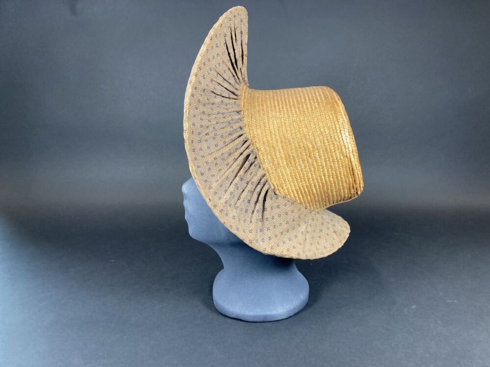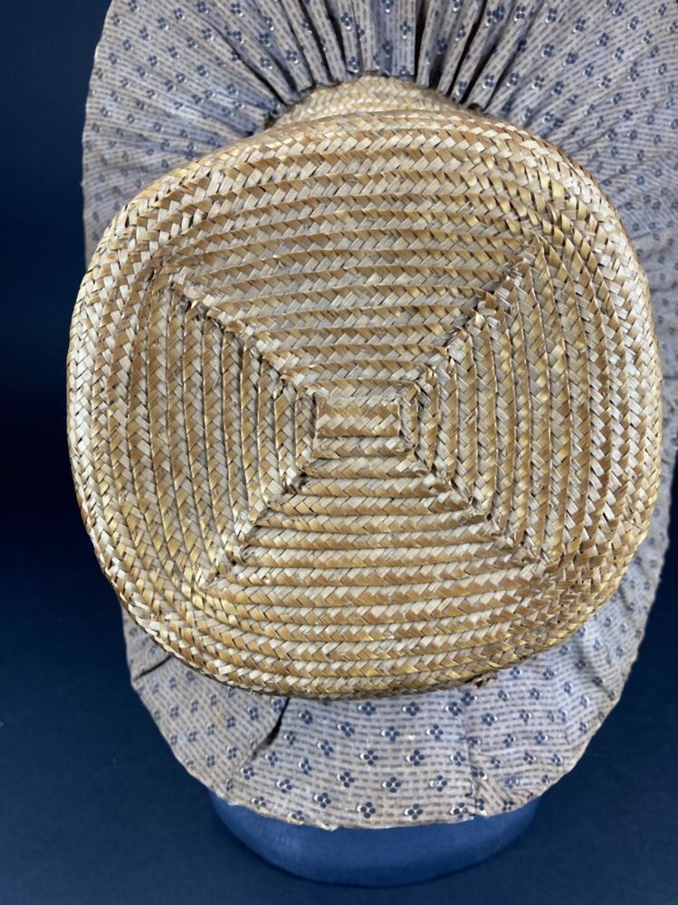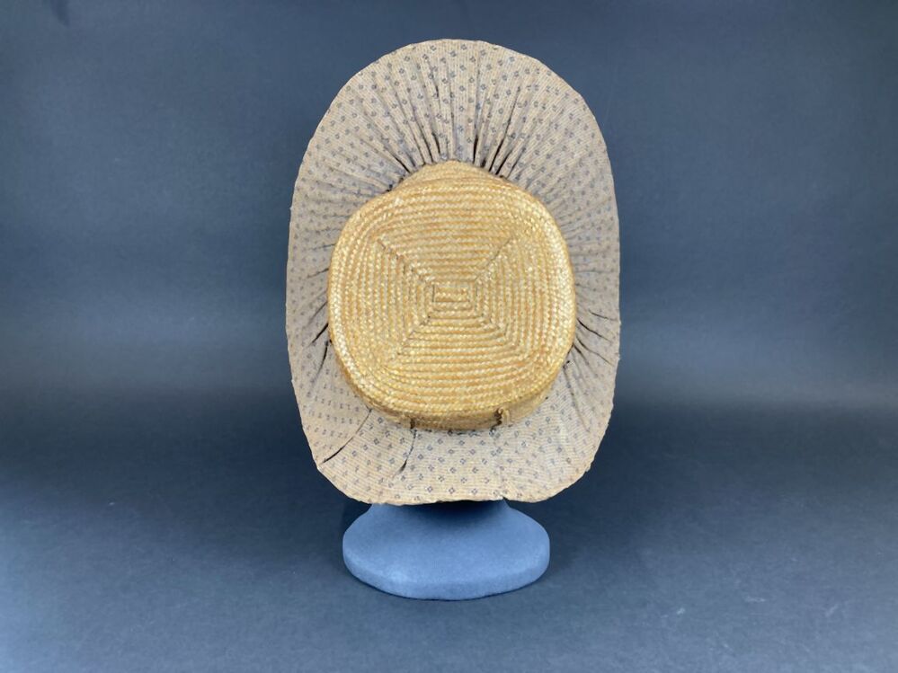 Gevoerde luifelhoed van stro met lila bedrukte katoen, in de nek versierd met zijden lint