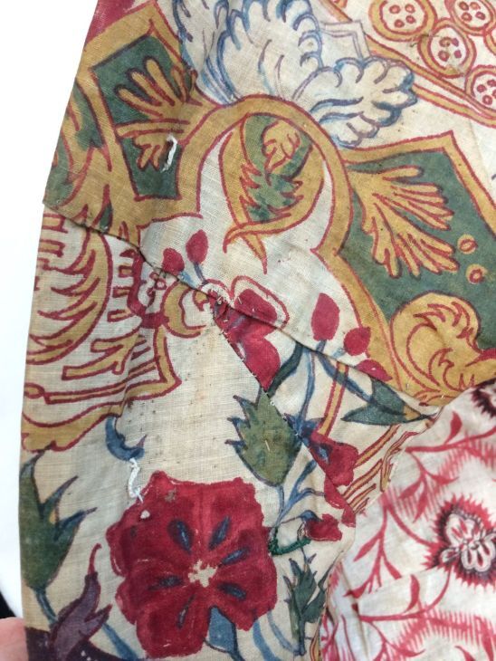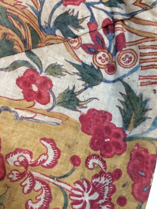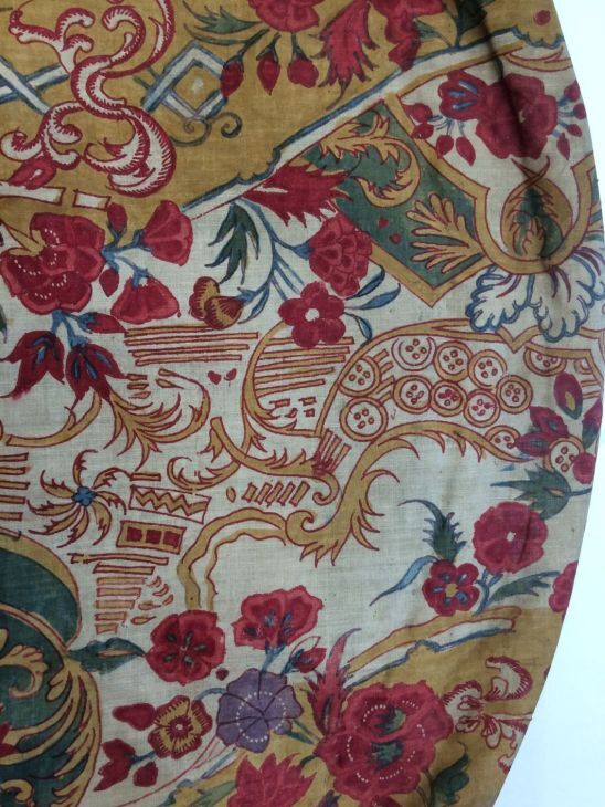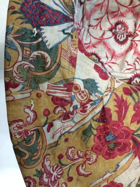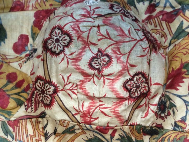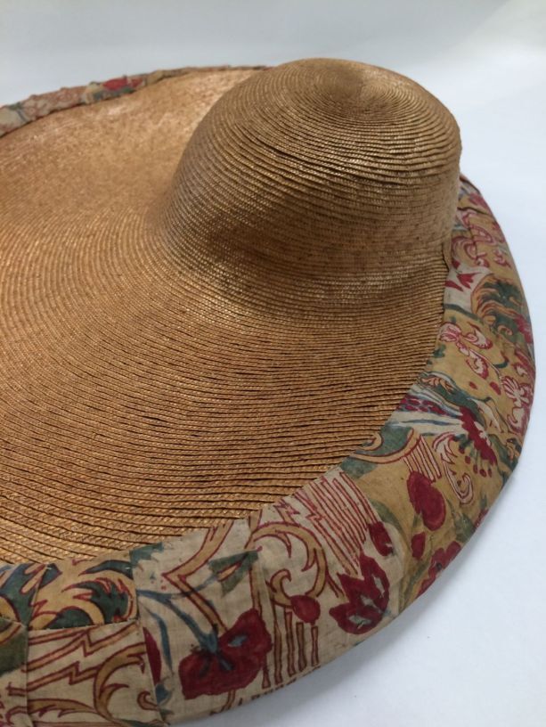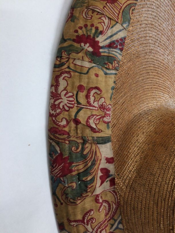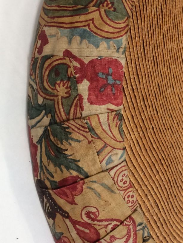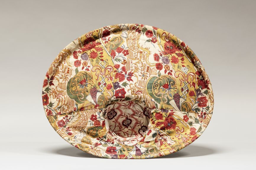 Kleine zonhoed met omgebogen rand, met sitsen voering met gele golvende banen, geometrische motiefjes en toefjes rode bloemen, gebaseerd op ontwerptekening van Daniël Marot op witte grond