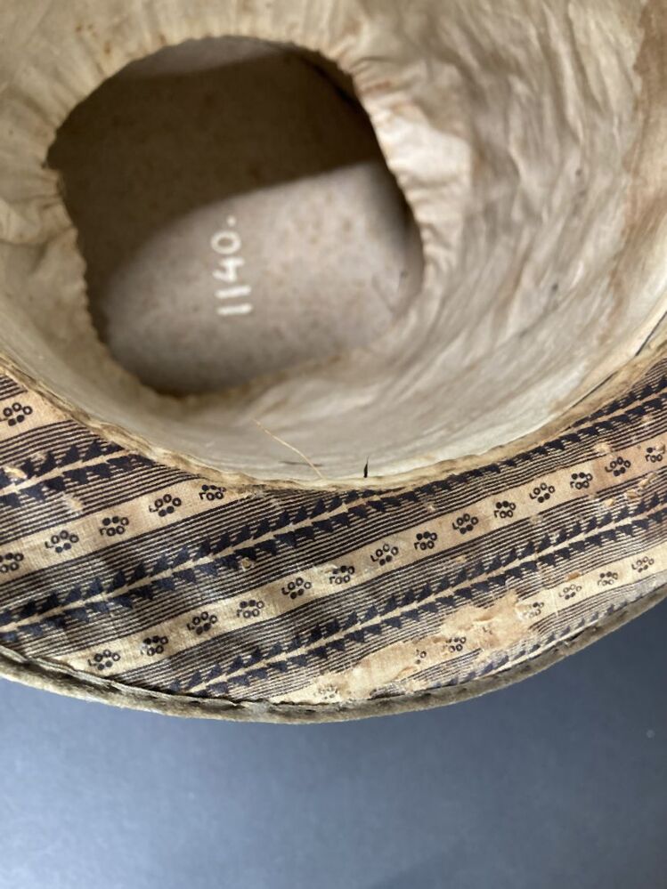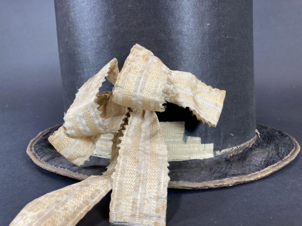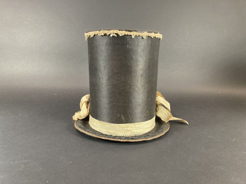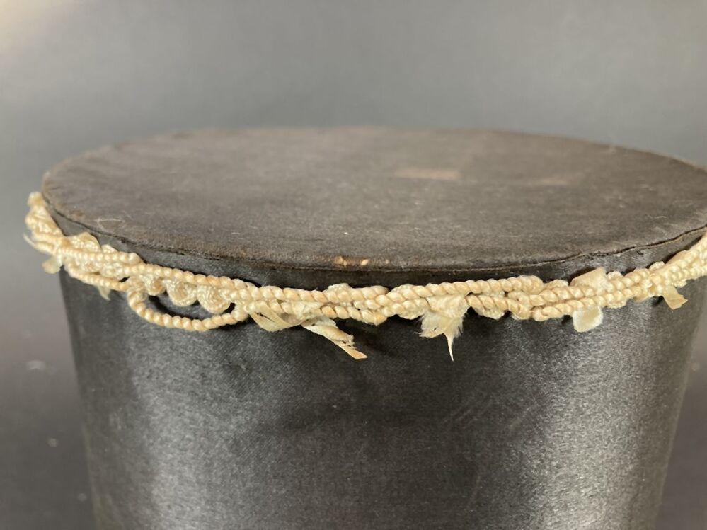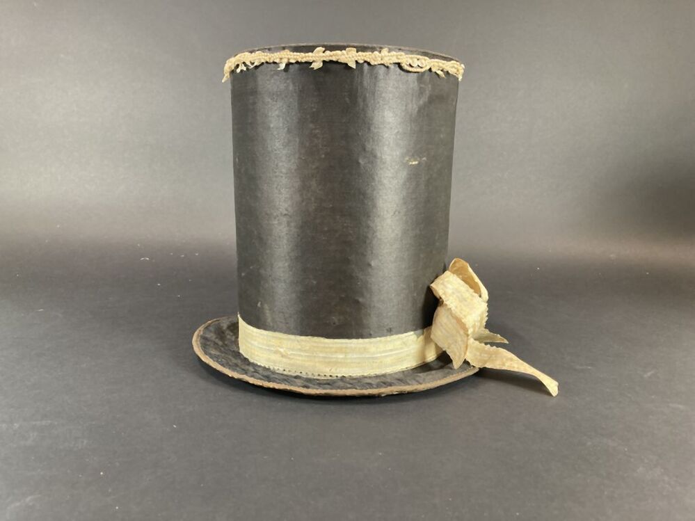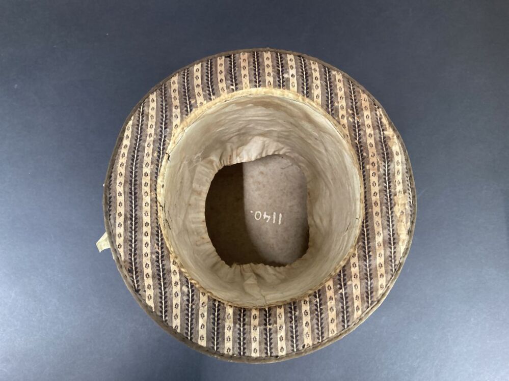 Markthoed van karton met rand van stro bedekt met zwarte satijnzijde en versierd van wit zijdelint en koord